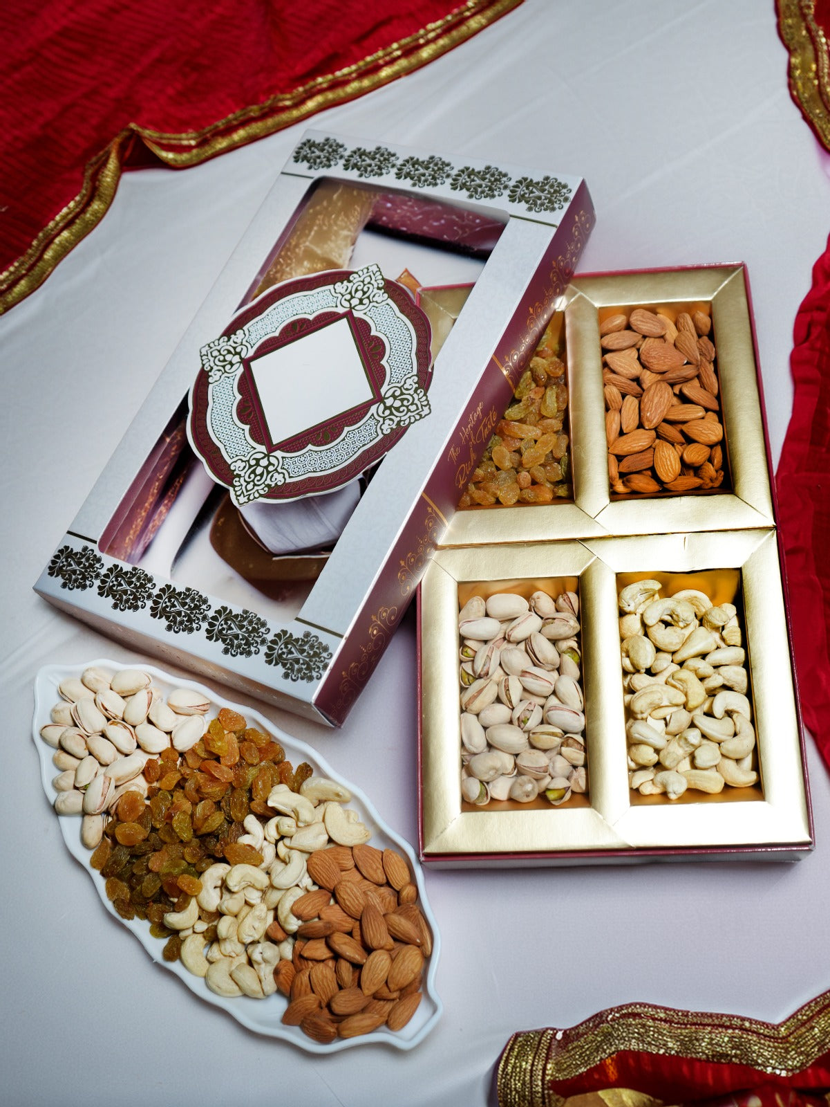 These boxes are commonly made from premium paper, cardboard, or wood, and may include design features such as gold foiling, embossing, and partitions to keep the dry fruits organized and appealing.